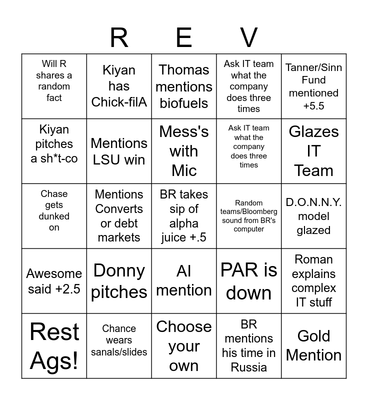 This bingo card has a free space and 26 words: AI mention, BR mentions his time in Russia, Mess's with Mic, Chance wears sanals/slides, Tanner/Sinn Fund mentioned +5.5, Will R shares a random fact, Kiyan pitches a sh*t-co, Kiyan has Chick-filA, D.O.N.N.Y. model glazed, PAR is down, Ask IT team what the company does three times, Chase gets dunked on, Roman explains complex IT stuff, Rest Ags!, Mentions Converts or debt markets, You are going to the social on Wednesday (hopefully the day is right), Ask IT team what the company does three times, Awesome said +2.5, Thomas mentions biofuels, Gold Mention, Glazes IT Team, Choose your own, Random teams/Bloomberg sound from BR's computer, Donny pitches, Mentions LSU win and Mentions Tu sucks.