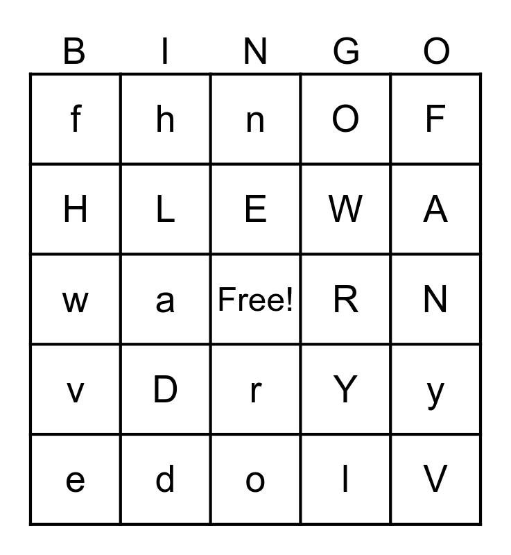 This bingo card has a free space and 24 words: D, d, E, e, F, f, H, h, R, r, W, w, Y, y, L, l, N, n, A, a, V, v, O and o.