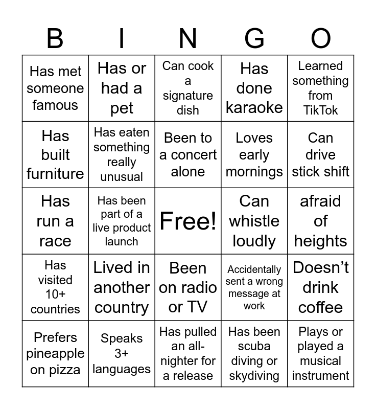 This bingo card has a free space and 24 words: Lived in another country, Speaks 3+ languages, Been to a concert alone, Prefers pineapple on pizza, Learned something from TikTok, Has met someone famous, Has built furniture, Has or had a pet, Can whistle loudly, Been on radio or TV, Loves early mornings, Has run a race, Accidentally sent a wrong message at work, Doesn’t drink coffee, Has eaten something really unusual, Has been scuba diving or skydiving, afraid of heights, Can cook a signature dish, Can drive stick shift, Has been part of a live product launch, Plays or played a musical instrument, Has visited 10+ countries, Has done karaoke and Has pulled an all-nighter for a release.