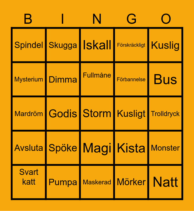 This bingo card has a free space and 24 words: Spöke, Pumpa, Fullmåne, Svart katt, Kuslig, Spindel, Mysterium, Skugga, Kusligt, Magi, Förbannelse, Mardröm, Kista, Monster, Dimma, Mörker, Trolldryck, Iskall, Bus, Godis, Natt, Avsluta, Förskräckligt and Maskerad.