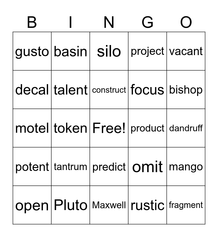 This bingo card has a free space and 24 words: tantrum, Pluto, construct, open, vacant, gusto, decal, basin, product, predict, focus, motel, omit, mango, talent, rustic, dandruff, silo, bishop, token, fragment, potent, project and Maxwell.