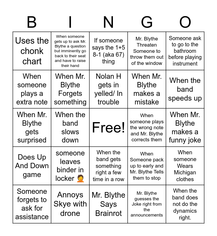 This bingo card has a free space and 24 words: someone leaves binder in locker 🤦, Annoys Skye with drone, Nolan H gets in yelled/ In trouble, Someone forgets to ask for assistance, Someone ask to go to the bathroom before playing instrument, Uses the chonk chart, When someone plays a extra note, When someone gets up to ask Mr. Blythe a question but imminently go back to their seat and have to raise their hand, When someone plays the wrong note and Mr. Blythe corrects them, When the band gets something right a few time in a row, When Mr. Blythe makes a mistake, When Mr. Blythe gets surprised, When Someone pack up to early and Mr. Blythe Tells them to stop, When someone Wears Michigan clothes, When Mr. Blythe Forgets something, Mr. Blythe guesses the Joke right from the announcements, When Mr. Blythe makes a funny joke, If someone says the 1+5 8-1 (aka 67) thing, When the band speeds up, When the band slows down, When the band does not do the dynamics right., Does Up And Down game, Mr. Blythe Threaten Someone to throw them out of the window and Mr. Blythe Says Brainrot.