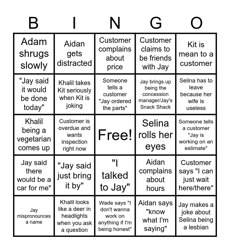 This bingo card has a free space and 26 words: "I talked to Jay", Aidan says "know what I'm saying", Someone tells a customer "Jay ordered the parts", Khalil looks like a deer in headlights when you ask a question, Kit is mean to a customer, Adam shrugs slowly, "Jay said it would be done today", Aidan gets distracted, Someone tells a customer "Jay is working on an estimate", Aidan complains about hours, Jay brings up being the concession manager/Jay's Snack Shack, Khalil being a vegetarian comes up, Customer says "I can just wait here/there", Jay mispronounces a name, Customer is overdue and wants inspection right now, Kit is mean to an employee, Customer claims to be friends with Jay, Jay said there would be a car for me", Customer complains about price, Jay makes a joke about Selina being a lesbian, Selina has to leave because her wife is useless, Wade says "I don't wanna work on anything if I'm being honest", Selina rolls her eyes, "Jay said just bring it by", Khalil takes Kit seriously when Kit is joking and Customer wants to know if we will install the part they bought.