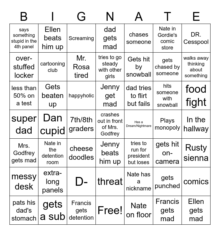 This bingo card has 49 words: messy desk, Gets beaten up, D-, Jenny beats him up, dad tries to flirt but fails, Plays monopoly, DR. Cesspool, pats his dad's stomach, cartooning club, 7th/8th graders, tries to go steady with other girls, chases someone, gets chased by someone, food fight, Mrs. Godfrey gets mad, Nate in the detention room, Screaming, Jenny get mad, Nate on floor, Nate in Gordie's comic store, walks away thinking about something, over-stuffed locker, Ellen beats him up, Mr. Rosa tired, Free!, Gets hit by snowball, hits someone with snowball, comics, says something stupid in the 4th panel, Dan cupid, Francis gets detention, threat, tries to run for president but loses, gets punched, In the hallway, super dad, extra-long panels, cheese doodles, crashes out in front of Mrs. Godfrey, Has a Dream/Nightmare, Francis gets mad, Rusty sienna, less than 50% on a test, gets a sub, happyholic, dad gets mad, Nate has a nickname, gets hit on-camera and Ellen gets mad.