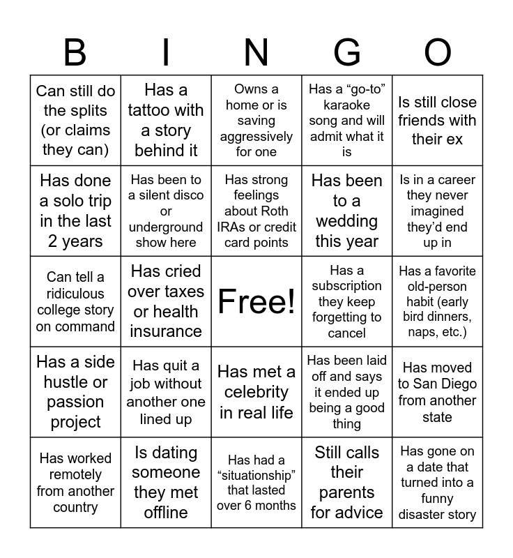 This bingo card has a free space and 24 words: Has quit a job without another one lined up, Is dating someone they met offline, Has strong feelings about Roth IRAs or credit card points, Has worked remotely from another country, Is still close friends with their ex, Can still do the splits (or claims they can), Has done a solo trip in the last 2 years, Has a tattoo with a story behind it, Has a subscription they keep forgetting to cancel, Has met a celebrity in real life, Has been to a wedding this year, Can tell a ridiculous college story on command, Has been laid off and says it ended up being a good thing, Has moved to San Diego from another state, Has been to a silent disco or underground show here, Still calls their parents for advice, Has a favorite old-person habit (early bird dinners, naps, etc.), Owns a home or is saving aggressively for one, Is in a career they never imagined they’d end up in, Has cried over taxes or health insurance, Has gone on a date that turned into a funny disaster story, Has a side hustle or passion project, Has a “go-to” karaoke song and will admit what it is and Has had a “situationship” that lasted over 6 months.