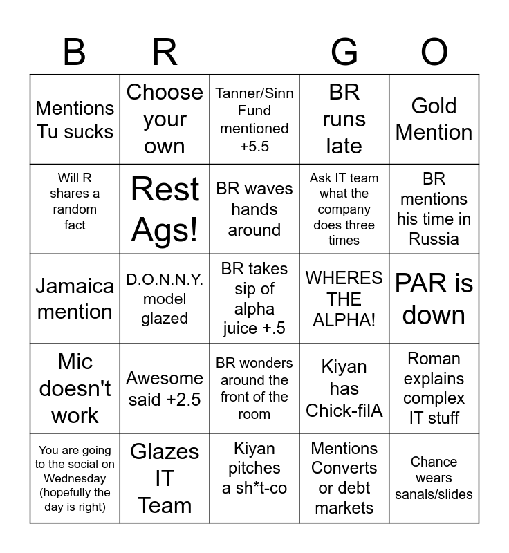This bingo card has a free space and 24 words: Awesome said +2.5, Glazes IT Team, BR waves hands around, You are going to the social on Wednesday (hopefully the day is right), Gold Mention, Mentions Tu sucks, Will R shares a random fact, Choose your own, WHERES THE ALPHA!, BR wonders around the front of the room, Ask IT team what the company does three times, Jamaica mention, Kiyan has Chick-filA, Roman explains complex IT stuff, Rest Ags!, Mentions Converts or debt markets, PAR is down, Tanner/Sinn Fund mentioned +5.5, BR mentions his time in Russia, D.O.N.N.Y. model glazed, Chance wears sanals/slides, Mic doesn't work, BR runs late and Kiyan pitches a sh*t-co.