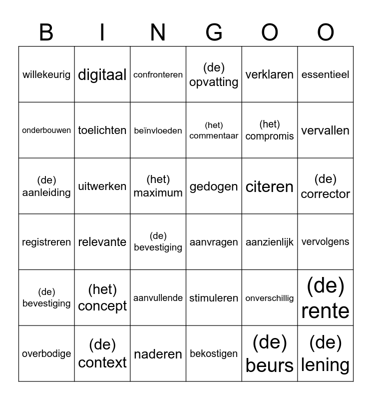 This bingo card has 50 words: (de) aankondiging, (de) aanleiding, aantreffen, aanzienlijk, citeren, (de) context, digitaal, (het) doel, essentieel, naderen, onderbouwen, (de) opvatting, relevante, registreren, selecteren, stimuleren, toelichten, uitwerken, (de) vaardigheid, verklaren, vervallen, vervolgens, willekeurig, beïnvloeden, (de) beschuldiging, (de) bevestiging, (het) commentaar, (het) conflict, confronteren, (de) corrector, ontkennen, onverschillig, verwijten, voorspellen, aanvragen, aanvullende, bekostigen, (de) beurs, (de) lening, (het) maximum, overbodige, (het) recht, (de) rente, studeren, (de) bevestiging, (het) compromis, (het) concept, ervaren, gedogen and (de) samenvatting.