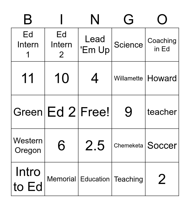 This bingo card has a free space and 25 words: 6, Education, 4, Intro to Ed, Coaching in Ed, Ed Intern 1, 11, Ed Intern 2, 9, 2.5, Willamette, Green, Chemeketa, Soccer, 10, Linfield, teacher, Lead 'Em Up, Howard, Ed 2, 2, Memorial, Western Oregon, Science and Teaching.