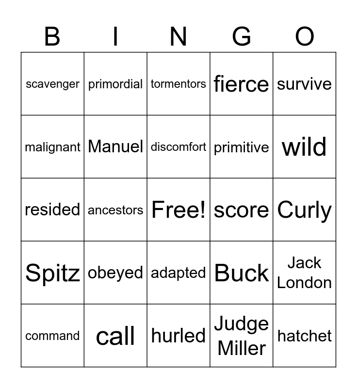 This bingo card has a free space and 24 words: obeyed, call, discomfort, command, survive, scavenger, malignant, primordial, score, adapted, primitive, resided, Buck, Jack London, Manuel, Judge Miller, Curly, tormentors, wild, ancestors, hatchet, Spitz, fierce and hurled.