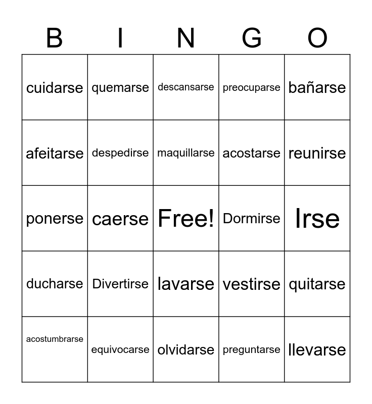 This bingo card has a free space and 29 words: acostumbrarse, broncearse, caerse, comerse, cuidarse, descansarse, despedirse, Divertirse, Dormirse, equivocarse, Irse, llevarse, olvidarse, preguntarse, reunirse, Sentirse, lavarse, ducharse, bañarse, ponerse, vestirse, acostarse, acostarse, afeitarse, preocuparse, quemarse, quitarse, maquillarse and levantarse.