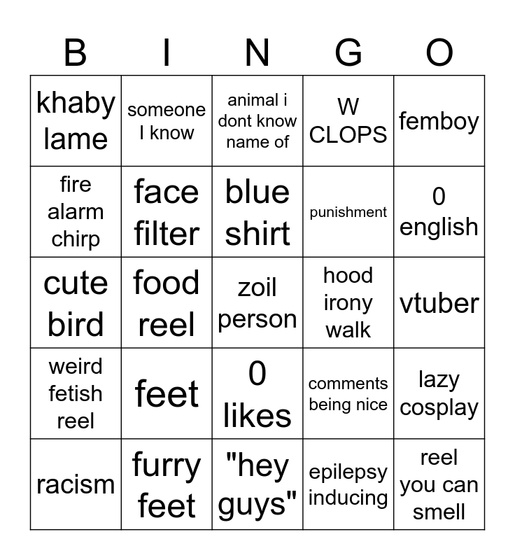 This bingo card has a free space and 24 words: feet, furry feet, blue shirt, racism, femboy, khaby lame, fire alarm chirp, someone I know, hood irony walk, 0 likes, punishment, cute bird, comments being nice, lazy cosplay, face filter, epilepsy inducing, vtuber, animal i dont know name of, 0 english, food reel, reel you can smell, weird fetish reel, W CLOPS and "hey guys".