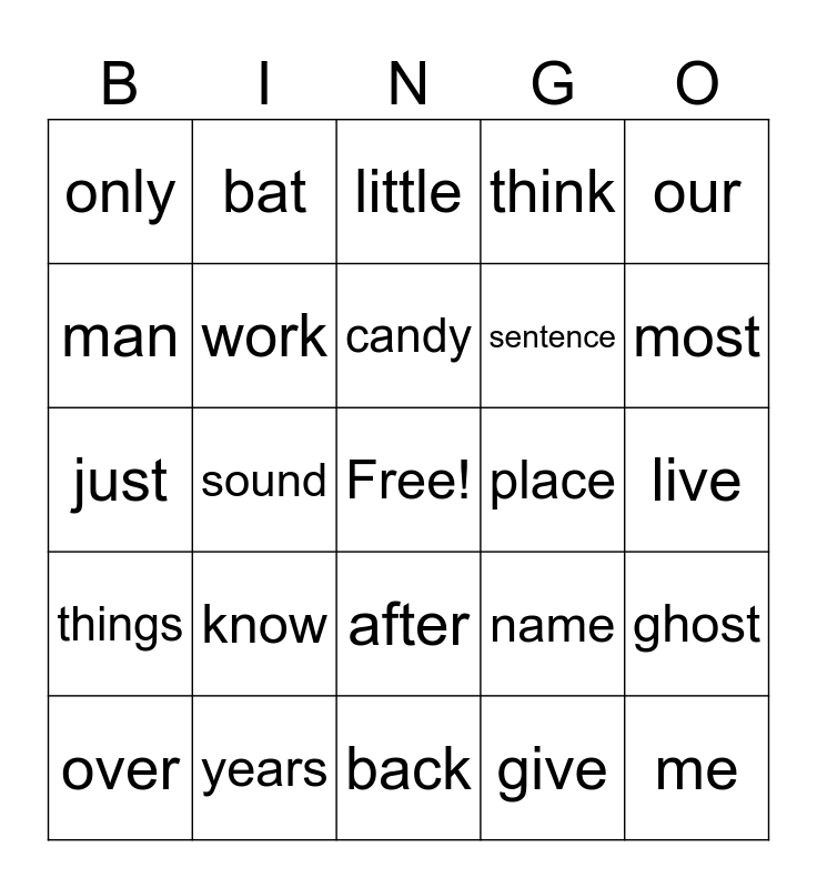 This bingo card has a free space and 29 words: over, new, sound, take, only, little, work, know, place, years, live, me, back, give, most, very, after, things, our, just, name, good, sentence, man, think, bat, ghost, candy and witch.