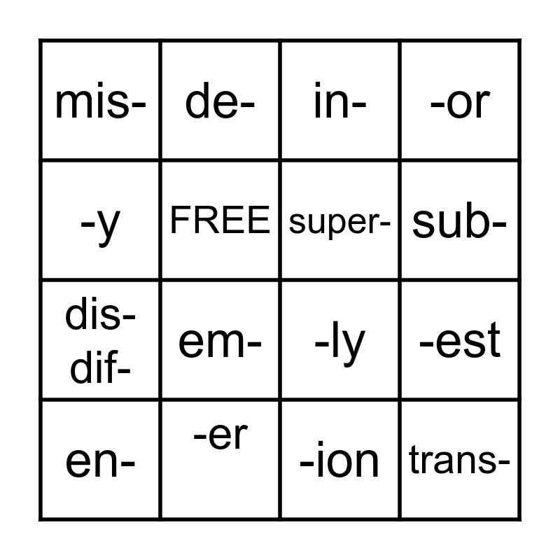 This bingo card has 16 words: -er, -est, in-, mis-, dis- dif-, de-, -ly, -ion, -y, FREE, en-, -or, em-, sub-, super- and trans-.