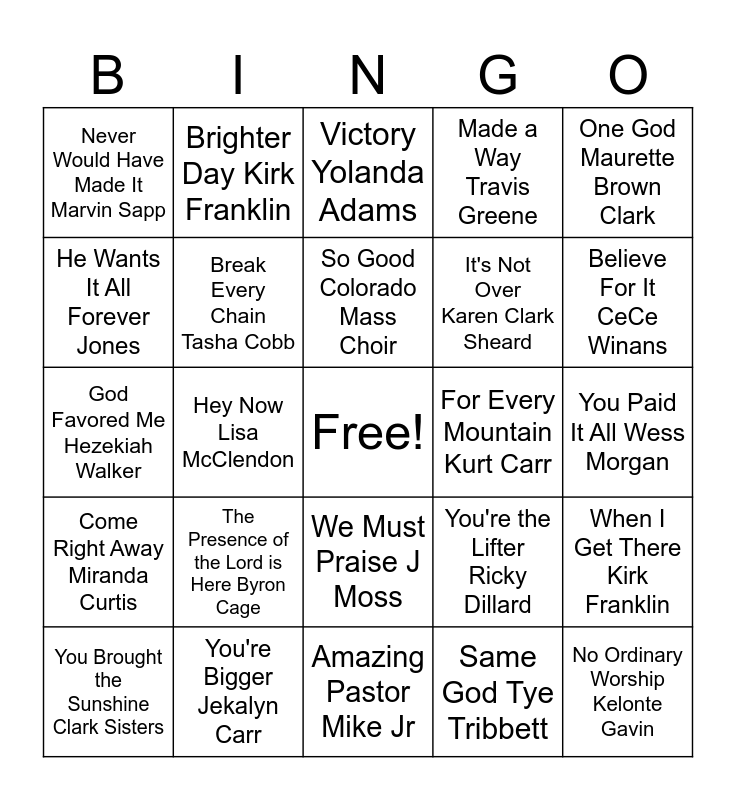 This bingo card has a free space and 39 words: Walking Mary Mary, You Don't Know Kierra Sheard, Stomp Kirk Franklin, Break Every Chain Tasha Cobb, You Brought the Sunshine Clark Sisters, We Must Praise J Moss, So Good Colorado Mass Choir, Oh, How Precious Kathy Taylor, One God Maurette Brown Clark, Come Right Away Miranda Curtis, Hey Now Lisa McClendon, Made a Way Travis Greene, No Ordinary Worship Kelonte Gavin, You Paid It All Wess Morgan, For Every Mountain Kurt Carr, The Presence of the Lord is Here Byron Cage, Only One Night Tho Tye Tribbett, Never Would Have Made It Marvin Sapp, Glory to Glory to Glory Fred Hammond, You're the Lifter Ricky Dillard, He Wants It All Forever Jones, Amazing Pastor Mike Jr, It's Not Over Karen Clark Sheard, Believe For It CeCe Winans, Won't He Do It Koryn Hawthorne, Jesus Be a Fence Fred Hammond, That's What I Believe Donnie McClurkin, God Is Able Smokie Norful, Count Your Blessings Kevin Davidson, Brighter Day Kirk Franklin, Because of Who You Are Vicki Yohe, Ain't No Need to Worry Marvin Winans, Victory Yolanda Adams, You're Bigger Jekalyn Carr, Same God Tye Tribbett, Trust in God Elevation Worship, When I Get There Kirk Franklin, God Favored Me Hezekiah Walker and Not Lucky I'm Loved Jonathan McReynolds.
