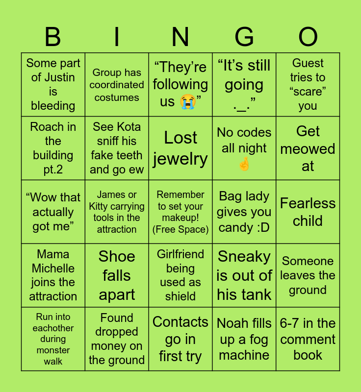 This bingo card has a free space and 24 words: Shoe falls apart, Found dropped money on the ground, Lost jewelry, Run into eachother during monster walk, Guest tries to “scare” you, Some part of Justin is bleeding, Roach in the building pt.2, Group has coordinated costumes, Bag lady gives you candy :D, Girlfriend being used as shield, No codes all night 🤞, “Wow that actually got me”, Sneaky is out of his tank, Someone leaves the ground, See Kota sniff his fake teeth and go ew, Noah fills up a fog machine, Fearless child, “They’re following us 😭”, Get meowed at, James or Kitty carrying tools in the attraction, 6-7 in the comment book, Mama Michelle joins the attraction, “It’s still going ._.” and Contacts go in first try.