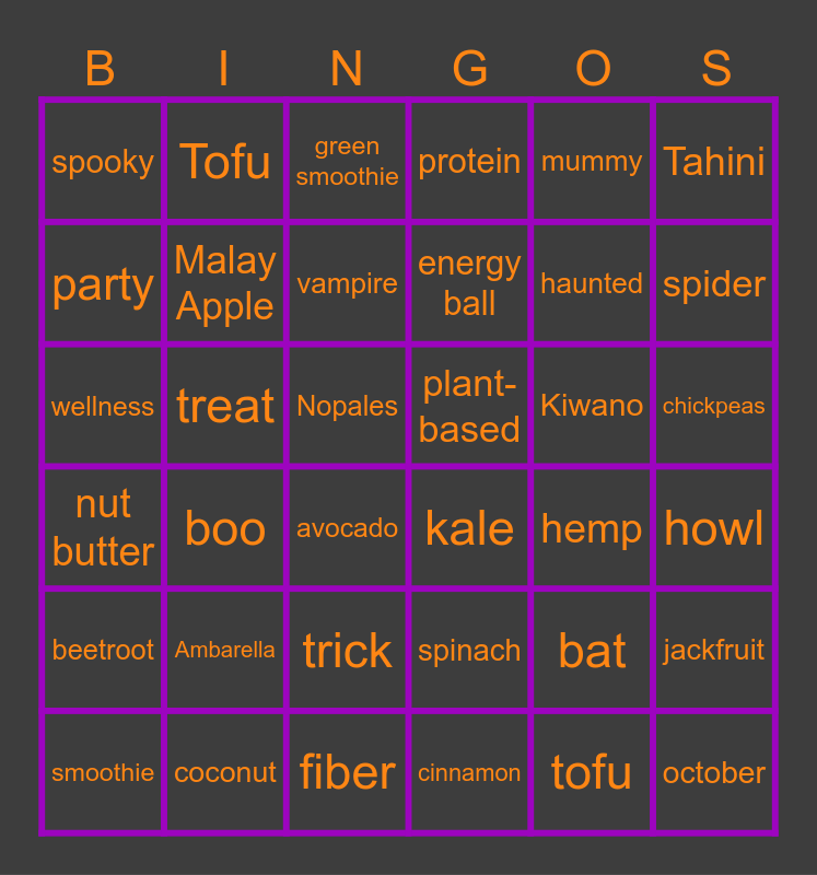 This bingo card has 65 words: Free!, bat, bones, boo, Ambarella, Sweet potato, Tofu, Kimchi, Malay Apple, Teff, chickpeas, mask, Nopales, mummy, pumpkin, Tahini, spider, spooky, amaranth, vampire, Kiwano, plant-based, protein, smoothie, veggies, tofu, fiber, vitamins, wellness, salad, avocado, green cauldron, pumpkin spice, glow bowl, nut butter, kale, chia, haunted, howl, october, party, trick, treat, cacao, almond, coconut, energy ball, superfood, beetroot, spinach, carrot, chia pudding, mushroom, hemp, almond milk, magic potion, witch brew, green smoothie, jackfruit, cinnamon, ginger, halloween feast, candy corn, moonlight magic and Cassava.