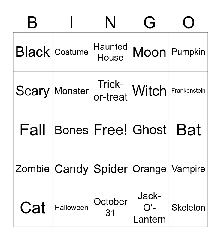 This bingo card has a free space and 24 words: Candy, Halloween, Trick-or-treat, Cat, Pumpkin, Black, Scary, Costume, Ghost, Spider, Witch, Fall, Orange, Vampire, Monster, Jack-O'-Lantern, Bat, Haunted House, Frankenstein, Bones, Skeleton, Zombie, Moon and October 31.