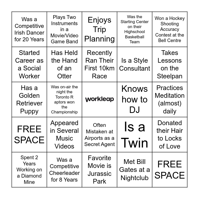 This bingo card has a free space and 24 words: Appeared in Several Music Videos, Was a Competitive Cheerleader for 8 Years, Recently Ran Their First 10km Race, Spent 2 Years Working on a Diamond Mine, Won a Hockey Shooting Accuracy Contest at the Bell Centre, Was a Competitive Irish Dancer for 20 Years, Started Career as a Social Worker, Plays Two Instruments in a Movie/Video Game Band, Knows how to DJ, Often Mistaken at Airports as a Secret Agent, Is a Style Consultant, Has a Golden Retriever Puppy, Is a Twin, Donated their Hair to Locks of Love, Has Held the Hand of an Otter, Met Bill Gates at a Nightclub, Practices Meditation (almost) daily, Enjoys Trip Planning, Takes Lessons on the Steelpan, Was on-air the night the Toronto Raptors won the Championship, FREE SPACE, FREE SPACE, Was the Starting Center on their Highschool Basketball Team and Favorite Movie is Jurassic Park.