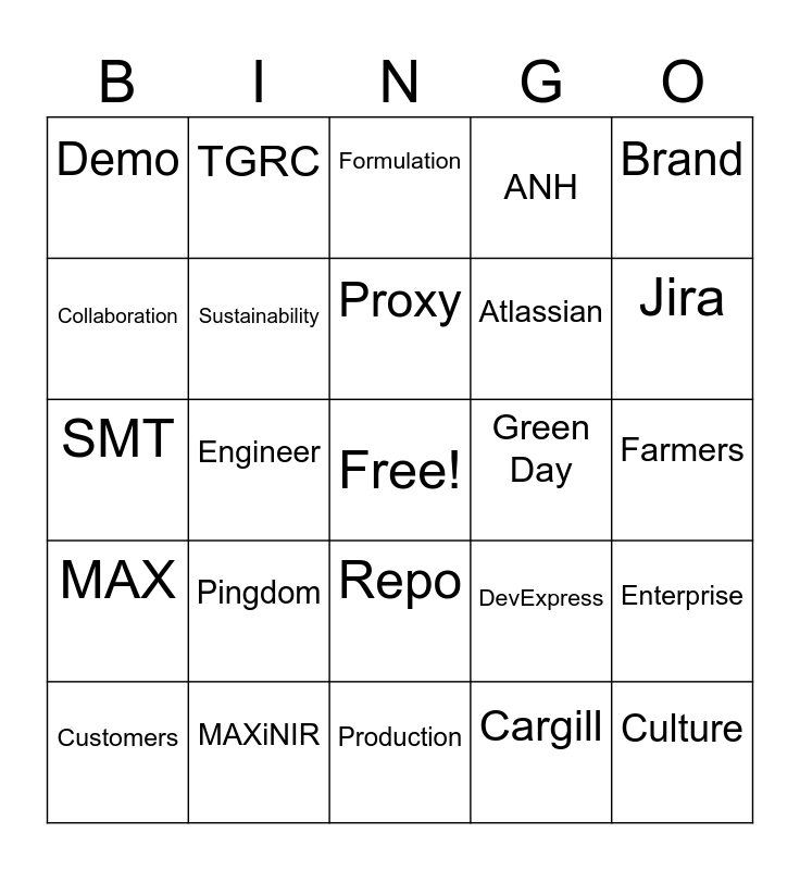This bingo card has a free space and 59 words: Agriculture, MAXiNIR, Implementation, MAX, Cargill, Pork, Sustainability, Software, Atlassian, Release, ANH, Deliver, Collaboration, Europe, Code of Conduct, Demo, Culture, Brand, Coding, Proxy, Green Day, Formulation, Customers, Enterprise, Cantina, MFA, Dairy Enteligen, Development, Jira, Diversity, Frontline, GitHub, DevOps, My Tech, TGRC, Products, Flockwise, Engineer, Perficient, SMT, Sprint, Pingdom, Farmers, Poultry, Strategy, Visual Studio Code, Tech Writing, DevTest, Repo, Production, Microsoft, Galleon, Development, Pipelines, Marketing, DevExpress, Ethics, Global and UAT.