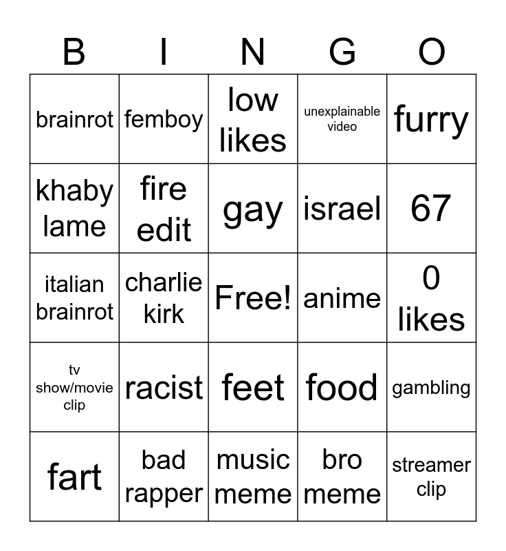 This bingo card has a free space and 24 words: racist, bad rapper, gay, fart, furry, brainrot, khaby lame, femboy, anime, feet, israel, italian brainrot, food, gambling, fire edit, bro meme, 0 likes, low likes, 67, charlie kirk, streamer clip, tv show/movie clip, unexplainable video and music meme.