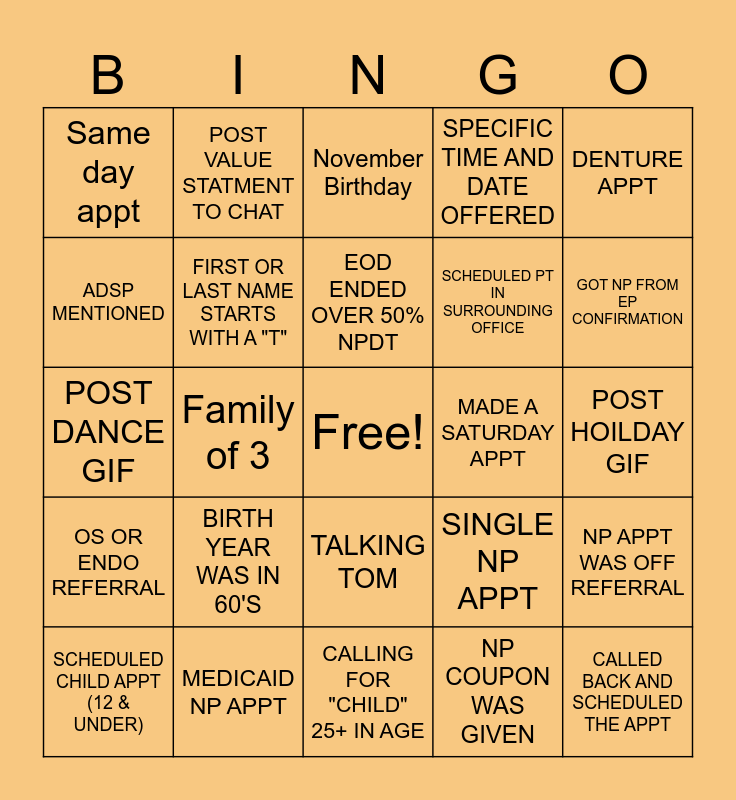 This bingo card has a free space and 30 words: MEDICAID NP APPT, Got an additional when asked, Family of 3, Double NPs, Same day appt, November Birthday, FIRST OR LAST NAME STARTS WITH A "T", TALKING TOM, MADE A SATURDAY APPT, CALLING FOR "CHILD" 25+ IN AGE, POST HOILDAY GIF, CALLED BACK AND SCHEDULED THE APPT, NP COUPON WAS GIVEN, MEDICAID NP APPT, GOT NP FROM EP CONFIRMATION, RESCHEDULE APPT IN FL, SINGLE NP APPT, OS OR ENDO REFERRAL, BIRTH YEAR WAS IN 60'S, DENTURE APPT, POST DANCE GIF, GOT APPT AFTER AN INITIAL "NO", POST VALUE STATMENT TO CHAT, SCHEDULED PT IN SURROUNDING OFFICE, ADSP MENTIONED, SPECIFIC TIME AND DATE OFFERED, NP APPT WAS OFF REFERRAL, SCHEDULED CHILD APPT (12 & UNDER), EOD ENDED OVER 50% NPDT and SCHEDULED AN APPT FOR "IM JUST CALLING ABOUT INSURANCE".