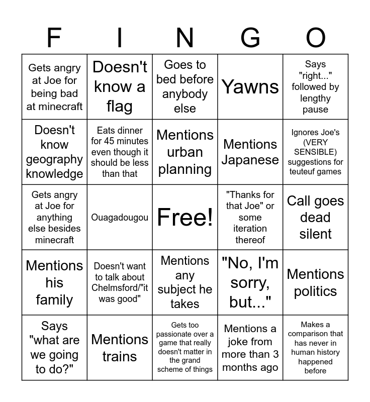This bingo card has a free space and 24 words: Doesn't want to talk about Chelmsford/"it was good", Mentions trains, Mentions urban planning, Says "what are we going to do?", Says "right..." followed by lengthy pause, Gets angry at Joe for being bad at minecraft, Doesn't know geography knowledge, Doesn't know a flag, "Thanks for that Joe" or some iteration thereof, Mentions any subject he takes, Mentions Japanese, Gets angry at Joe for anything else besides minecraft, "No, I'm sorry, but...", Mentions politics, Eats dinner for 45 minutes even though it should be less than that, Mentions a joke from more than 3 months ago, Call goes dead silent, Goes to bed before anybody else, Ignores Joe's (VERY SENSIBLE) suggestions for teuteuf games, Ouagadougou, Makes a comparison that has never in human history happened before, Mentions his family, Yawns and Gets too passionate over a game that really doesn't matter in the grand scheme of things.