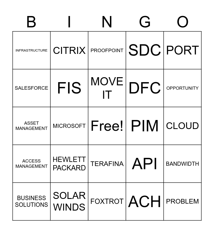 This bingo card has a free space and 75 words: WEBDEV, ACTIAN, MOVE IT, DR, NETWORK, SERVICE DESK, WELLS FARGO, NAVIGATOR, RPA, GATEWAY, SERVER, CISCO, TERAFINA, DFC, DIGITAL, SALESFORCE, SOLAR WINDS, NEXT GEN, IVR, OPPORTUNITY, QA, CITRIX, FOXTROT, SDC, PORT, PSM, Q2, PAYMENTS EXCHANGE, SQL, CYBER, NETCOM, DELUXE, DIRECTOR, API, CLOUD, INFRASTRUCTURE, NCR, PEP+, PIM, PROBLEM, INFO SEC, GLIA, DIGITAL BANKING, SLA, REBOOT, ENDPOINT, MICROSOFT, PROOFPOINT, VLAN, CIRCUIT, DATABASE, FIS, COMMUNICATOR OPEN, AEM, BOT, COMPUTER OPS, LEXIS NEXIS, SHAREPOINT, POB, SOLUTION, BUSINESS SOLUTIONS, FISERV, CARD WIZARD, VPN, VIRTUAL, ASSET MANAGEMENT, JACK HENRY, INTEGRATED TELLER, RFC, BANDWIDTH, ACCESS MANAGEMENT, HEWLETT PACKARD, BUSINESS ANALYTICS, ACH and AUTOMATION.