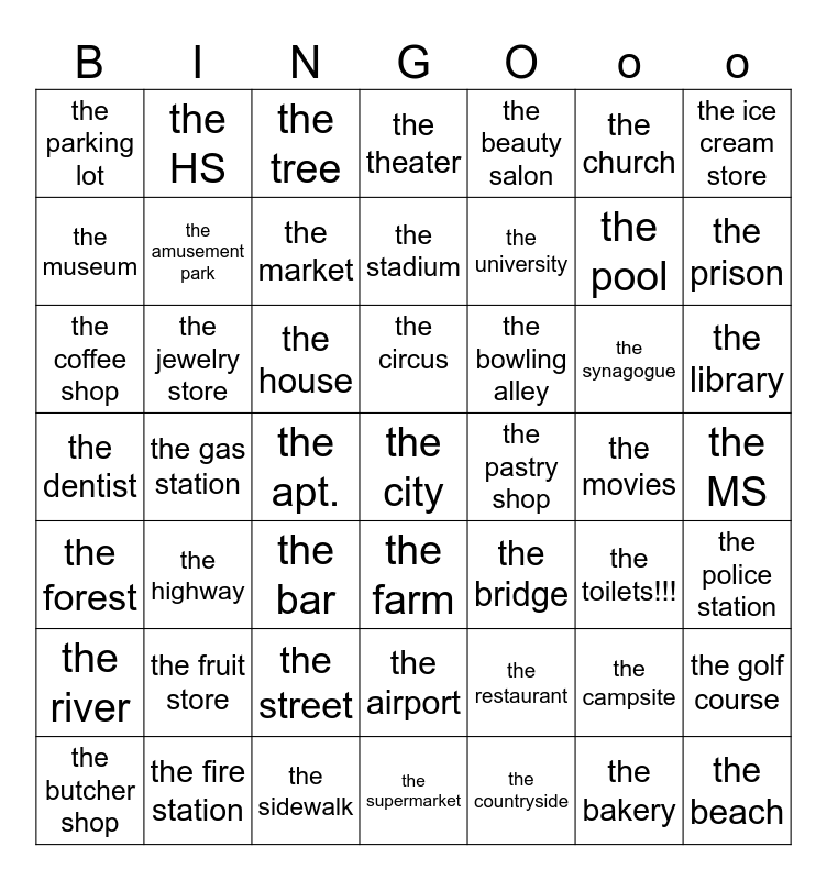 This bingo card has a free space and 48 words: the restaurant, the pool, the supermarket, the gas station, the house, the MS, the HS, the fire station, the church, the farm, the ice cream store, the theater, the synagogue, the bowling alley, the river, the movies, the museum, the prison, the campsite, the beauty salon, the university, the apt., the parking lot, the amusement park, the golf course, the market, the library, the butcher shop, the circus, the jewelry store, the bakery, the pastry shop, the police station, the fruit store, the dentist, the bridge, the toilets!!!, the coffee shop, the bar, the street, the forest, the beach, the tree, the sidewalk, the stadium, the airport, the highway and the countryside.