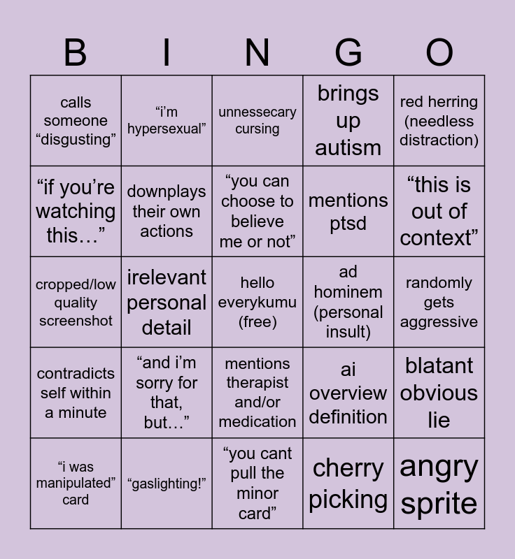 This bingo card has a free space and 29 words: “i was manipulated” card, unbacked claim, irelevant personal detail, “it’s an explanation not an excuse”, calls someone “disgusting”, unnessecary cursing, downplays their own actions, “and i’m sorry for that, but…”, ad hominem (personal insult), “gaslighting!”, randomly gets aggressive, angry sprite, “you cant pull the minor card”, cherry picking, “this is out of context”, uses a word/phrase incorrectly, mentions therapist and/or medication, contradicts self within a minute, red herring (needless distraction), cropped/low quality screenshot, ai overview definition, blame shifting, mentions ptsd, “if you’re watching this…”, brings up autism, “i’m hypersexual”, blatant obvious lie, “you can choose to believe me or not” and mystifying vague statement.