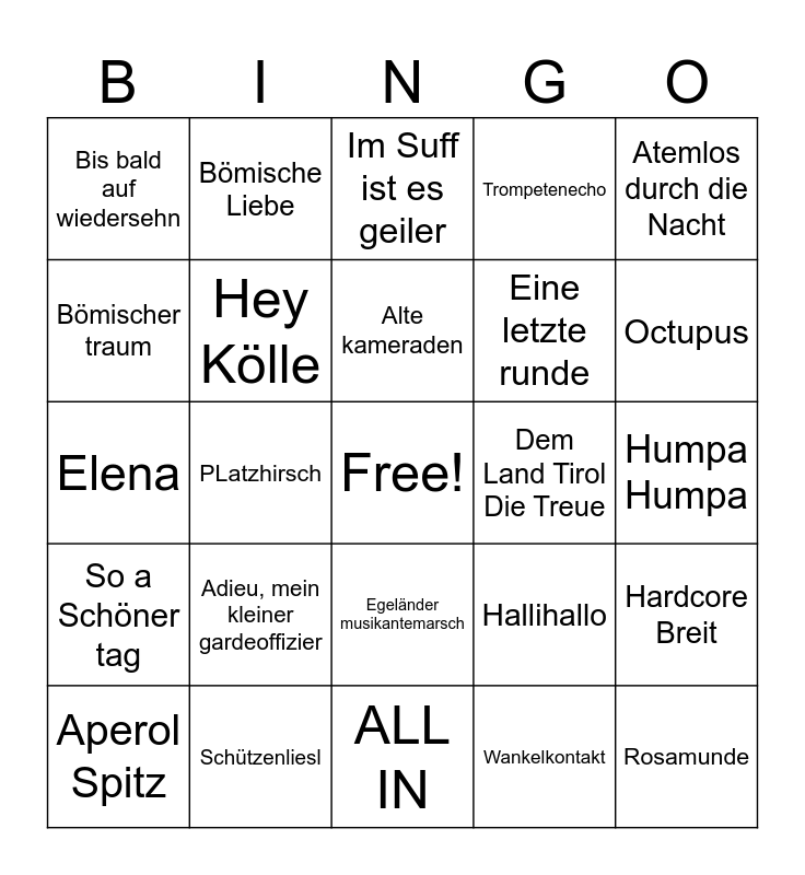 This bingo card has a free space and 25 words: Adieu, mein kleiner gardeoffizier, ALL IN, Alte kameraden, Aperol Spitz, Atemlos durch die Nacht, Bis bald auf wiedersehn, Bömischer traum, Bömische Liebe, Dem Land Tirol Die Treue, Egeländer musikantemarsch, Eine letzte runde, Elena, Hallihallo, Hardcore Breit, Hey Kölle, Hey-mann-Polka, Humpa Humpa, Im Suff ist es geiler, Octupus, PLatzhirsch, Rosamunde, Schützenliesl, So a Schöner tag, Trompetenecho and Wankelkontakt.