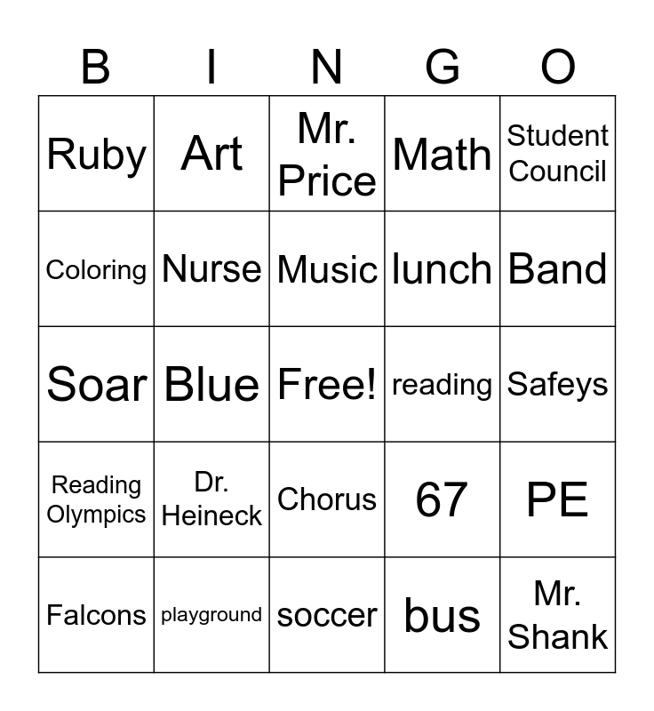 This bingo card has a free space and 29 words: Falcons, Mr. Stover, Blue, White, Ruby, Mr. Price, Nurse, Dr. Heineck, reading, playground, Safeys, Mr. Shank, soccer, bus, Band, Orchestra, Chorus, Reading Olympics, Student Council, Soar, 67, buddies, lunch, Coloring, Math, Art, PE, Music and Tech.