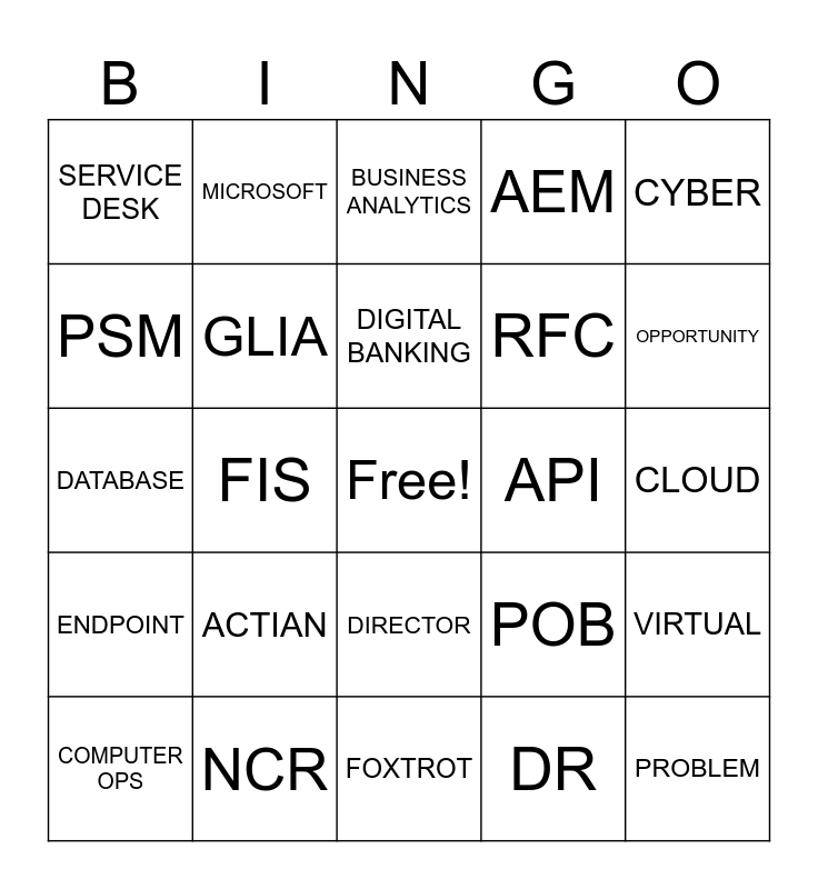 This bingo card has a free space and 75 words: INFO SEC, WELLS FARGO, DIGITAL BANKING, ACH, GATEWAY, INFRASTRUCTURE, SOLAR WINDS, PAYMENTS EXCHANGE, RPA, NETWORK, NETCOM, Q2, DIRECTOR, RFC, DIGITAL, PSM, NCR, PEP+, SDC, OPPORTUNITY, QA, MICROSOFT, FOXTROT, AEM, CYBER, SALESFORCE, LEXIS NEXIS, PROOFPOINT, SLA, PORT, SERVER, JACK HENRY, TERAFINA, POB, CLOUD, SERVICE DESK, HEWLETT PACKARD, SHAREPOINT, API, PROBLEM, WEBDEV, FISERV, INTEGRATED TELLER, VLAN, CIRCUIT, ACCESS MANAGEMENT, FIS, BUSINESS ANALYTICS, PIM, REBOOT, ASSET MANAGEMENT, GLIA, MOVE IT, DFC, BOT, BUSINESS SOLUTIONS, DELUXE, CARD WIZARD, SQL, SOLUTION, COMPUTER OPS, CITRIX, NAVIGATOR, VPN, BANDWIDTH, DATABASE, CISCO, COMMUNICATOR OPEN, IVR, VIRTUAL, ENDPOINT, ACTIAN, NEXT GEN, DR and AUTOMATION.