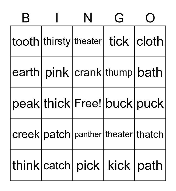 This bingo card has a free space and 24 words: patch, catch, crank, think, cloth, tooth, earth, thirsty, buck, panther, thump, peak, theater, thatch, pink, kick, puck, theater, bath, thick, path, creek, tick and pick.