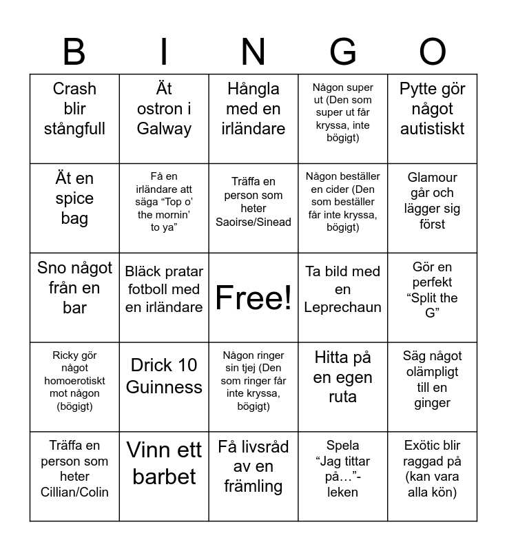 This bingo card has a free space and 24 words: Drick 10 Guinness, Vinn ett barbet, Träffa en person som heter Saoirse/Sinead, Träffa en person som heter Cillian/Colin, Pytte gör något autistiskt, Crash blir stångfull, Ät en spice bag, Ät ostron i Galway, Ta bild med en Leprechaun, Någon ringer sin tjej (Den som ringer får inte kryssa, bögigt), Någon beställer en cider (Den som beställer får inte kryssa, bögigt), Sno något från en bar, Hitta på en egen ruta, Säg något olämpligt till en ginger, Få en irländare att säga “Top o’ the mornin’ to ya”, Spela “Jag tittar på…”-leken, Gör en perfekt “Split the G”, Hångla med en irländare, Glamour går och lägger sig först, Bläck pratar fotboll med en irländare, Exötic blir raggad på (kan vara alla kön), Ricky gör något homoerotiskt mot någon (bögigt), Någon super ut (Den som super ut får kryssa, inte bögigt) and Få livsråd av en främling.