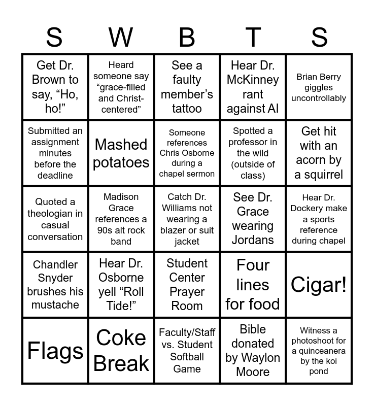 This bingo card has 36 words: Dr. Dockery's Alabama baseball cap, Dr. Grace in a Dallas Stars Jersey, Getting to go home early, Mashed potatoes, Four lines for food, Chandler Snyder brushes his mustache, Someone references Chris Osborne during a chapel sermon, Adam Dodd says "AI", Brian Berry giggles uncontrollably, Jon Okinaga in an aloha shirt...I guess that's the middle gimme space., Madison Grace references a 90s alt rock band, Hear Dr. McKinney rant against AI, Free!, See Dr. Grace wearing Jordans, Get hit with an acorn by a squirrel, Get Dr. Brown to say, “Ho, ho!”, Witness a photoshoot for a quinceanera by the koi pond, Hear Dr. Osborne yell “Roll Tide!”, Catch Dr. Williams not wearing a blazer or suit jacket, See a faulty member’s tattoo, Hear Dr. Dockery make a sports reference during chapel, Cigar!, Coke Break, Flags, Faculty/Staff vs. Student Softball Game, Heard someone say “grace-filled and Christ-centered”, Quoted a theologian in casual conversation, Mentioned “Greek” or “Hebrew” at least once today, Spotted a professor in the wild (outside of class), Submitted an assignment minutes before the deadline, Misplaced your SWBTS ID, Played “Where’s Waldo” when trying to find a VP, Bible donated by Waylon Moore, Student Center Prayer Room, 2 Timothy 2:2 Room and Steps to Peace with God tract.