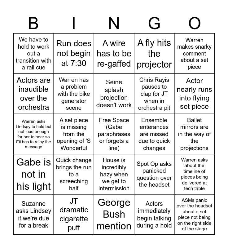 This bingo card has a free space and 29 words: Suzanne asks Lindsey if we're due for a break, Lindsey gets lost calling the Paris Ballet, A set piece is missing from the opening of 'S Wonderful, A boom gets knocked out of focus, We have to hold to work out a transition with a rail cue, A wire has to be re-gaffed, Warren has a problem with the bike generator scene, Quick change brings the run to a screeching halt, Ensemble enterances are missed due to quick changes, JT dramatic cigarette puff, Ballet mirrors are in the way of the projections, ASMs panic over the headset about a set piece not being on the right side of the stage, George Bush mention, Actors immediately begin talking during a hold, Actor nearly runs into flying set piece, ASMs have to respike something, House is incredibly hazy when we get to intermission, Gabe is not in his light, Warren makes snarky comment about a set piece, Warren asks Lindsey to hold but not loud enough for her to hear so Eli has to relay the message, Spot Op asks panicked question over the headset, Ballet mirror spikes are missed, Chris Rayis pauses to clap for JT when in orchestra pit, Actors are inaudible over the orchestra, A fly hits the projector, Run does not begin at 7:30, Warren asks about the timeline of pieces being delivered at tech table, Seine splash projection doesn't work and Projection is visible on the Eiffel tower legs.