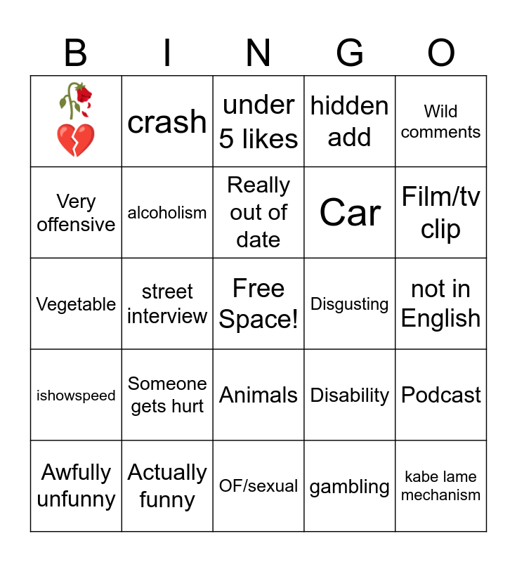 This bingo card has a free space and 24 words: Someone gets hurt, Actually funny, Really out of date, Awfully unfunny, Wild comments, 🥀💔, Very offensive, crash, Disgusting, Animals, Car, Vegetable, Disability, Podcast, alcoholism, gambling, not in English, under 5 likes, Film/tv clip, street interview, kabe lame mechanism, ishowspeed, hidden add and OF/sexual.
