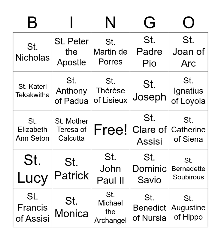 This bingo card has a free space and 25 words: St. Patrick, St. Michael the Archangel, St. Thérèse of Lisieux, St. Francis of Assisi, St. Joan of Arc, St. Nicholas, St. Kateri Tekakwitha, St. Peter the Apostle, St. Clare of Assisi, St. John Paul II, St. Joseph, St. Elizabeth Ann Seton, St. Dominic Savio, St. Bernadette Soubirous, St. Anthony of Padua, St. Carlo Acutis, St. Catherine of Siena, St. Martin de Porres, St. Ignatius of Loyola, St. Mother Teresa of Calcutta, St. Augustine of Hippo, St. Monica, St. Lucy, St. Padre Pio and St. Benedict of Nursia.