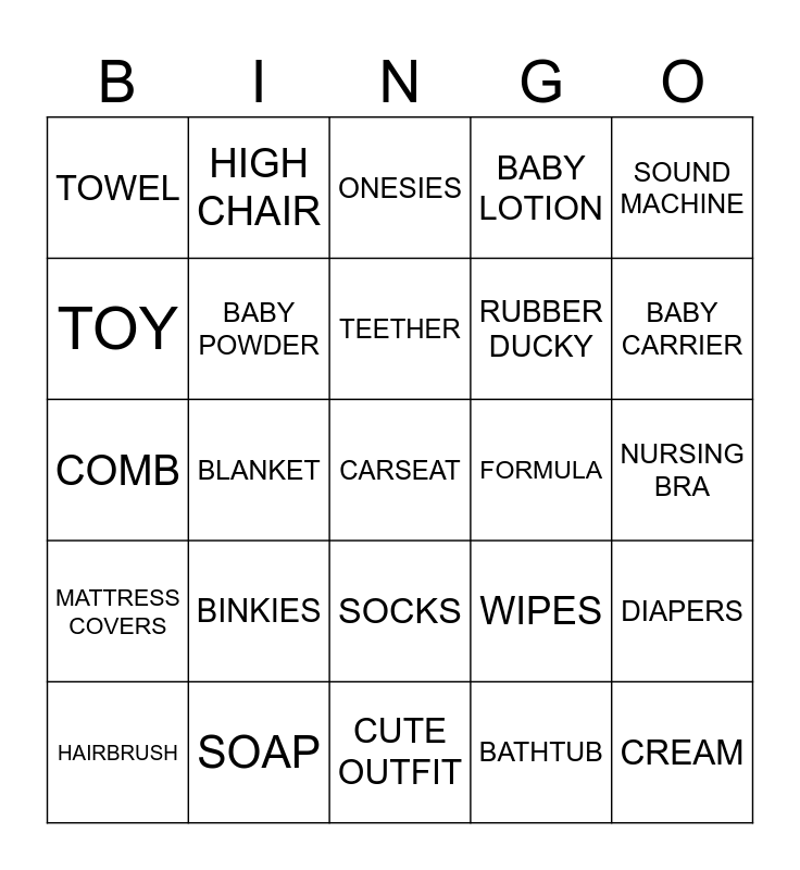 This bingo card has 50 words: BOTTLE, CARSEAT, STROLLER, CUTE OUTFIT, BINKIES, HAT, HIGH CHAIR, BOOK, TOY, BURP CLOTHS, BABY POWDER, BABY LOTION, DIAPERS, WIPES, SHOES, BIB, TEETHER, FORMULA, SOMETHING FOR MAMA, SOUND MACHINE, BLANKET, BATHTUB, TOWEL, RUBBER DUCKY, SHEETS, CREAM, BABY CARRIER, BABY BOUNCER, ONESIES, SOCKS, STROLLER FAN, CARSEAT COVER, THERMOMETER, NAIL TRIMMER, SOAP, RUG, HAMPER, JAMMIES, MEDICINE, NURSING BRA, PUMP, BOTTLE CLEANERS, MILK STORAGE BAGS, NURSING PADS, HAIRBRUSH, COMB, DIAPER BAG, CHANGING PAD, MATTRESS COVERS and BABY SPOON.
