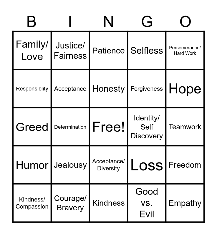 This bingo card has a free space and 24 words: Jealousy, Courage/ Bravery, Honesty, Kindness/ Compassion, Perserverance/ Hard Work, Family/ Love, Responsiblity, Justice/ Fairness, Identity/ Self Discovery, Acceptance/ Diversity, Forgiveness, Greed, Loss, Freedom, Acceptance, Good vs. Evil, Teamwork, Patience, Hope, Determination, Empathy, Humor, Selfless and Kindness.