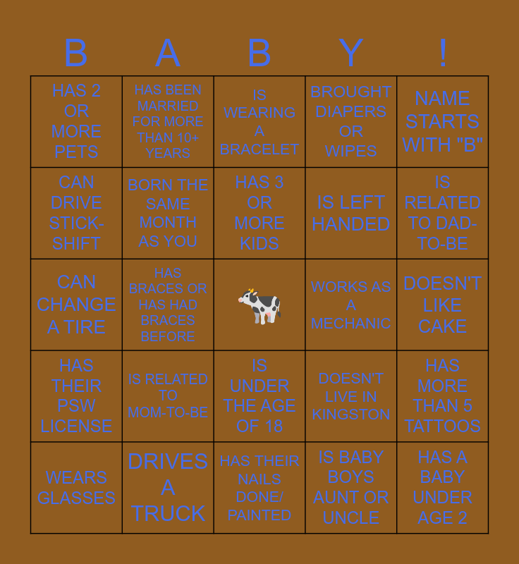 This bingo card has a free space and 24 words: IS RELATED TO MOM-TO-BE, DRIVES A TRUCK, HAS 3 OR MORE KIDS, WEARS GLASSES, NAME STARTS WITH "B", HAS 2 OR MORE PETS, CAN DRIVE STICK-SHIFT, HAS BEEN MARRIED FOR MORE THAN 10+ YEARS, WORKS AS A MECHANIC, IS UNDER THE AGE OF 18, IS LEFT HANDED, CAN CHANGE A TIRE, DOESN'T LIVE IN KINGSTON, HAS MORE THAN 5 TATTOOS, BORN THE SAME MONTH AS YOU, IS BABY BOYS AUNT OR UNCLE, DOESN'T LIKE CAKE, IS WEARING A BRACELET, IS RELATED TO DAD-TO-BE, HAS BRACES OR HAS HAD BRACES BEFORE, HAS A BABY UNDER AGE 2, HAS THEIR PSW LICENSE, BROUGHT DIAPERS OR WIPES and HAS THEIR NAILS DONE/ PAINTED.