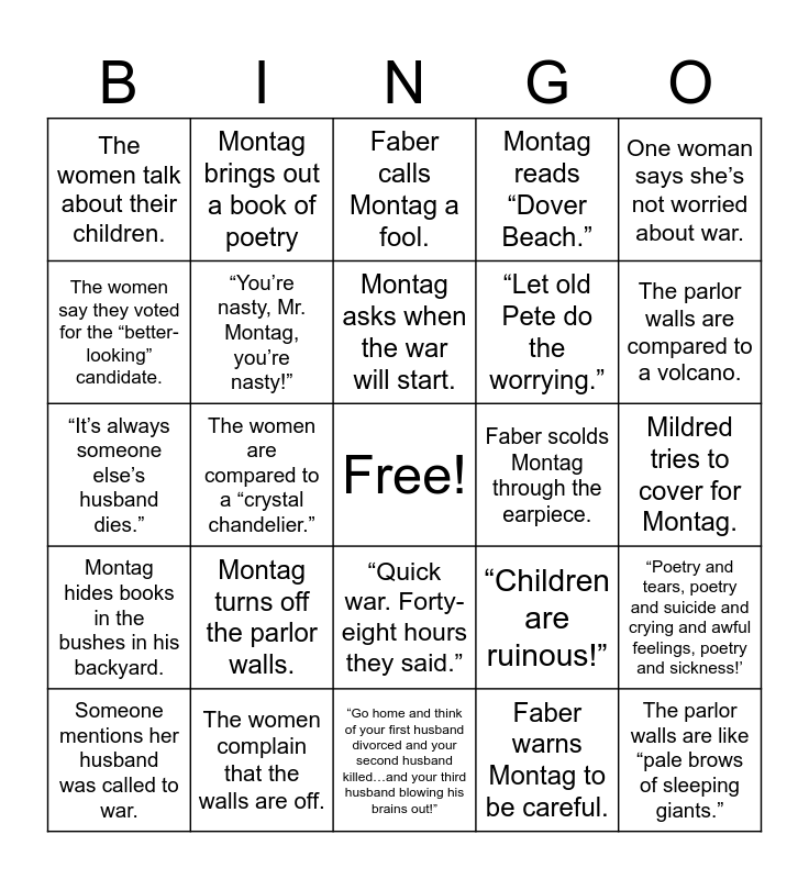 This bingo card has a free space and 24 words: Montag turns off the parlor walls., The women complain that the walls are off., Montag asks when the war will start., Someone mentions her husband was called to war., One woman says she’s not worried about war., The women talk about their children., The women say they voted for the “better-looking” candidate., Montag brings out a book of poetry, Faber scolds Montag through the earpiece., “Quick war. Forty-eight hours they said.”, “Let old Pete do the worrying.”, “It’s always someone else’s husband dies.”, “Children are ruinous!”, “Poetry and tears, poetry and suicide and crying and awful feelings, poetry and sickness!’, “You’re nasty, Mr. Montag, you’re nasty!”, Faber warns Montag to be careful., Mildred tries to cover for Montag., Faber calls Montag a fool., The parlor walls are compared to a volcano., The women are compared to a “crystal chandelier.”, The parlor walls are like “pale brows of sleeping giants.”, Montag hides books in the bushes in his backyard., Montag reads “Dover Beach.” and “Go home and think of your first husband divorced and your second husband killed…and your third husband blowing his brains out!”.