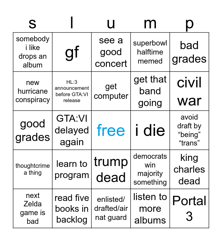 This bingo card has a free space and 24 words: learn to program, read five books in backlog, get computer, next Zelda game is bad, bad grades, somebody i like drops an album, new hurricane conspiracy, gf, i die, trump dead, get that band going, good grades, democrats win majority something, king charles dead, HL:3 announcement before GTA:VI release, listen to more albums, avoid draft by “being” “trans”, see a good concert, civil war, GTA:VI delayed again, Portal 3, thoughtcrime a thing, superbowl halftime memed and enlisted/ drafted/air nat guard.