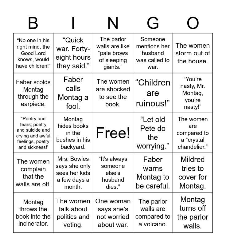 This bingo card has a free space and 24 words: Mrs. Bowles says she only sees her kids a few days a month., The women talk about politics and voting., The women are shocked to see the book., Montag throws the book into the incinerator., The women storm out of the house., “No one in his right mind, the Good Lord knows, would have children!”, Faber scolds Montag through the earpiece., “Quick war. Forty-eight hours they said.”, “Let old Pete do the worrying.”, “It’s always someone else’s husband dies.”, “Children are ruinous!”, “Poetry and tears, poetry and suicide and crying and awful feelings, poetry and sickness!’, Faber warns Montag to be careful., Mildred tries to cover for Montag., Faber calls Montag a fool., The parlor walls are compared to a volcano., The women are compared to a “crystal chandelier.”, The parlor walls are like “pale brows of sleeping giants.”, “You’re nasty, Mr. Montag, you’re nasty!”, Montag hides books in the bushes in his backyard., Montag turns off the parlor walls., The women complain that the walls are off., Someone mentions her husband was called to war. and One woman says she’s not worried about war..