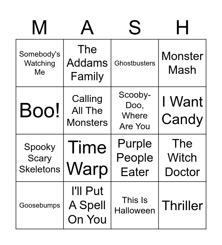 This bingo card has 16 words: I'll Put A Spell On You, The Witch Doctor, Ghostbusters, Somebody's Watching Me, Spooky Scary Skeletons, The Addams Family, Purple People Eater, This Is Halloween, Boo!, Calling All The Monsters, Goosebumps, Monster Mash, Time Warp, I Want Candy, Scooby-Doo, Where Are You and Thriller.