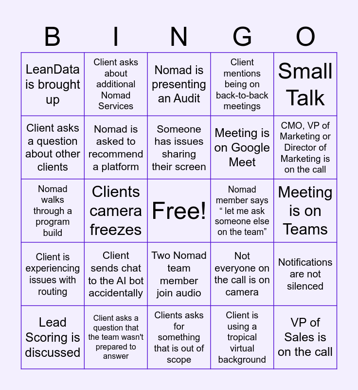 This bingo card has a free space and 24 words: Client sends chat to the AI bot accidentally, Client asks a question that the team wasn't prepared to answer, Someone has issues sharing their screen, Lead Scoring is discussed, Small Talk, LeanData is brought up, Client asks a question about other clients, Client asks about additional Nomad Services, Nomad member says “ let me ask someone else on the team”, Two Nomad team member join audio, Meeting is on Google Meet, Nomad walks through a program build, Not everyone on the call is on camera, Notifications are not silenced, Nomad is asked to recommend a platform, Client is using a tropical virtual background, Meeting is on Teams, Nomad is presenting an Audit, CMO, VP of Marketing or Director of Marketing is on the call, Clients camera freezes, VP of Sales is on the call, Client is experiencing issues with routing, Client mentions being on back-to-back meetings and Clients asks for something that is out of scope.