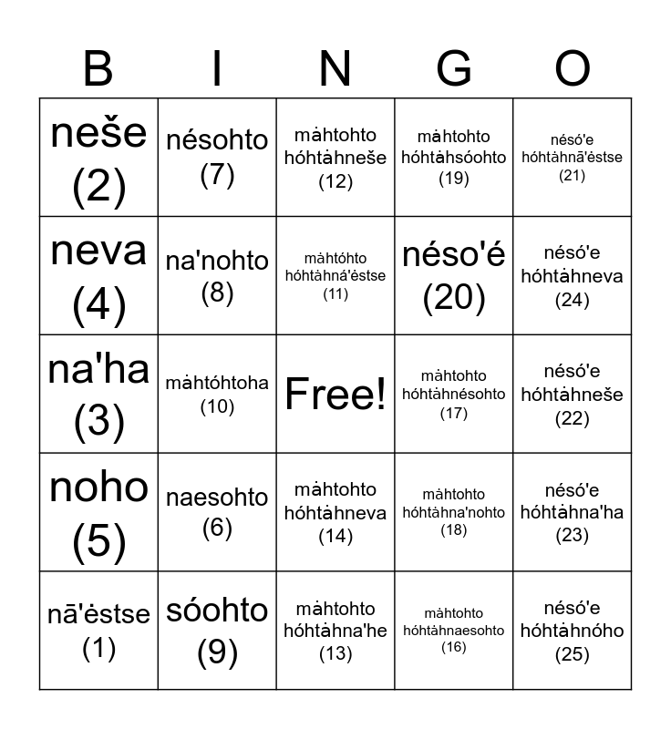 This bingo card has a free space and 24 words: nā'ėstse (1), naesohto (6), mȧhtóhto hóhtȧhná'ėstse (11), mȧhtohto hóhtȧhnaesohto (16), nésó'e hóhtȧhnā'ėstse (21), neše (2), nésohto (7), mȧhtohto hóhtȧhneše (12), mȧhtohto hóhtȧhnésohto (17), nésó'e hóhtȧhneše (22), na'ha (3), na'nohto (8), mȧhtohto hóhtȧhna'nohto (18), nésó'e hóhtȧhna'ha (23), neva (4), sóohto (9), mȧhtohto hóhtȧhna'he (13), mȧhtohto hóhtȧhsóohto (19), nésó'e hóhtȧhneva (24), noho (5), mȧhtóhtoha (10), mȧhtohto hóhtȧhneva (14), néso'é (20) and nésó'e hóhtȧhnóho (25).