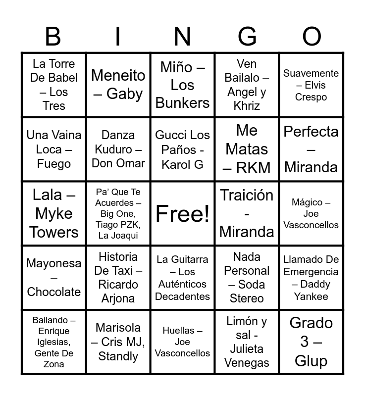 This bingo card has a free space and 33 words: Caraluna – Bacilos, Sopa De Caracol – Banda Blanca, Pa’ Que Te Acuerdes – Big One, Tiago PZK, La Joaqui, Waka waka - Shakira, Mayonesa – Chocolate, Danza Kuduro – Don Omar, Suavemente – Elvis Crespo, Bailando – Enrique Iglesias, Gente De Zona, Meneito – Gaby, Aserejé – Las Ketchup, Gucci Los Paños - Karol G, Miño – Los Bunkers, Llueve Sobre La Ciudad – Los Bunkers, Ai Se Eu Te Pego – Michel Teló, Traición - Miranda, Perfecta – Miranda, Marisola – Cris MJ, Standly, Lala – Myke Towers, Historia De Taxi – Ricardo Arjona, Nada Personal – Soda Stereo, La Guitarra – Los Auténticos Decadentes, El Matador – Los Fabulosos Cadillacs, La Torre De Babel – Los Tres, Mágico – Joe Vasconcellos, Huellas – Joe Vasconcellos, Grado 3 – Glup, Ven Bailalo – Angel y Khriz, Me Matas – RKM, Una Vaina Loca – Fuego, Llamado De Emergencia – Daddy Yankee, Rompe - Daddy Yankee, Limón y sal - Julieta Venegas and Tangananica Tangananá - 31 minutos.