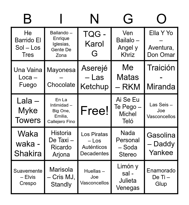 This bingo card has a free space and 33 words: Mi Primer Millón – Bacilos, Sopa De Caracol – Banda Blanca, En La Intimidad – Big One, Emilia, Callejero Fino, Las Flores – Café Tacvba, Waka waka - Shakira, Mayonesa – Chocolate, Ella Y Yo – Aventura, Don Omar, Suavemente – Elvis Crespo, Bailando – Enrique Iglesias, Gente De Zona, Meneito – Gaby, Aserejé – Las Ketchup, TQG - Karol G, Miño – Los Bunkers, No Me Hables De Sufrir – Los Bunkers, Ai Se Eu Te Pego – Michel Teló, Traición - Miranda, Marisola – Cris MJ, Standly, Lala – Myke Towers, Historia De Taxi – Ricardo Arjona, Nada Personal – Soda Stereo, Los Piratas – Los Auténticos Decadentes, El Matador – Los Fabulosos Cadillacs, He Barrido El Sol – Los Tres, Las Seis – Joe Vasconcellos, Huellas – Joe Vasconcellos, Enamorado De Ti – Glup, Ven Bailalo – Angel y Khriz, Me Matas – RKM, Una Vaina Loca – Fuego, Gasolina – Daddy Yankee, Lo Que Pasó, Pasó - Daddy Yankee, Limón y sal - Julieta Venegas and Mi equilibrio espiritual - 31 minutos.