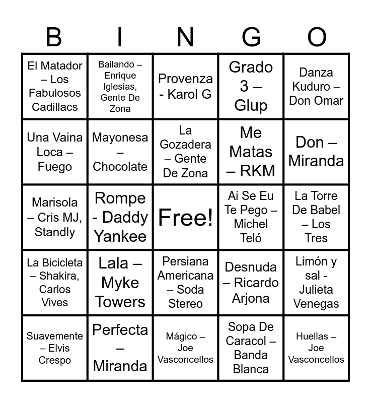 This bingo card has a free space and 34 words: Tabaco Y Chanel – Bacilos, Sopa De Caracol – Banda Blanca, Si Un Día Estas Sola – Big One, Emanero Y Valentino Merlo, Eres – Café Tacvba, La Bicicleta – Shakira, Carlos Vives, Mayonesa – Chocolate, Danza Kuduro – Don Omar, Suavemente – Elvis Crespo, Bailando – Enrique Iglesias, Gente De Zona, Meneito – Gaby, La Gozadera – Gente De Zona, Provenza - Karol G, Miño – Los Bunkers, Llueve Sobre La Ciudad – Los Bunkers, Ai Se Eu Te Pego – Michel Teló, Don – Miranda, Perfecta – Miranda, Marisola – Cris MJ, Standly, Lala – Myke Towers, Desnuda – Ricardo Arjona, Persiana Americana – Soda Stereo, La Guitarra – Los Auténticos Decadentes, El Matador – Los Fabulosos Cadillacs, La Torre De Babel – Los Tres, Mágico – Joe Vasconcellos, Huellas – Joe Vasconcellos, Grado 3 – Glup, Ven Bailalo – Angel y Khriz, Me Matas – RKM, Una Vaina Loca – Fuego, Llamado De Emergencia – Daddy Yankee, Rompe - Daddy Yankee, Limón y sal - Julieta Venegas and Tangananica Tangananá - 31 minutos.